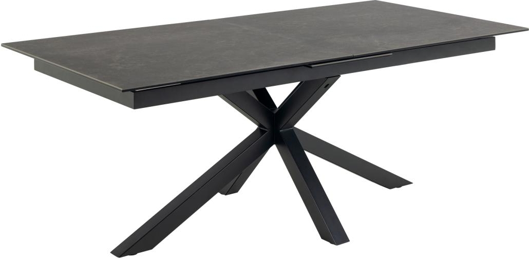 Förlängningsbart matbord med bordsskiva av keramik och kryssben av pulverlackerad metall. Bordsskivan är både värmebeständig och reptålig. Har plats för 6-8 personer.