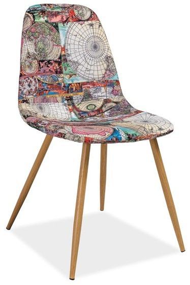 En mysig matstol med en stilren design. Underredet är tillverkat av metall med ett härligt ek utförande och sitsen är klädd med ett mycket behagligt mönstrat tyg för maximal komfort.
