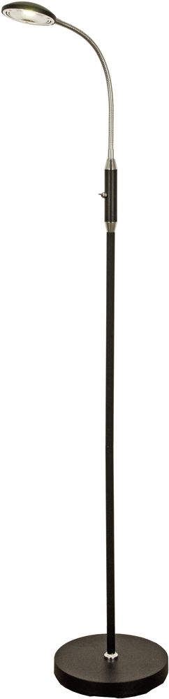 Golvlampa i svart metall med detaljer i krom. Vridbart lamphuvud. Strömbrytare på stommen.