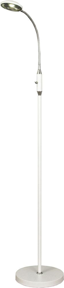 Golvlampa i vit metall med detaljer i krom. Vridbart lamphuvud. Strömbrytare på stommen.