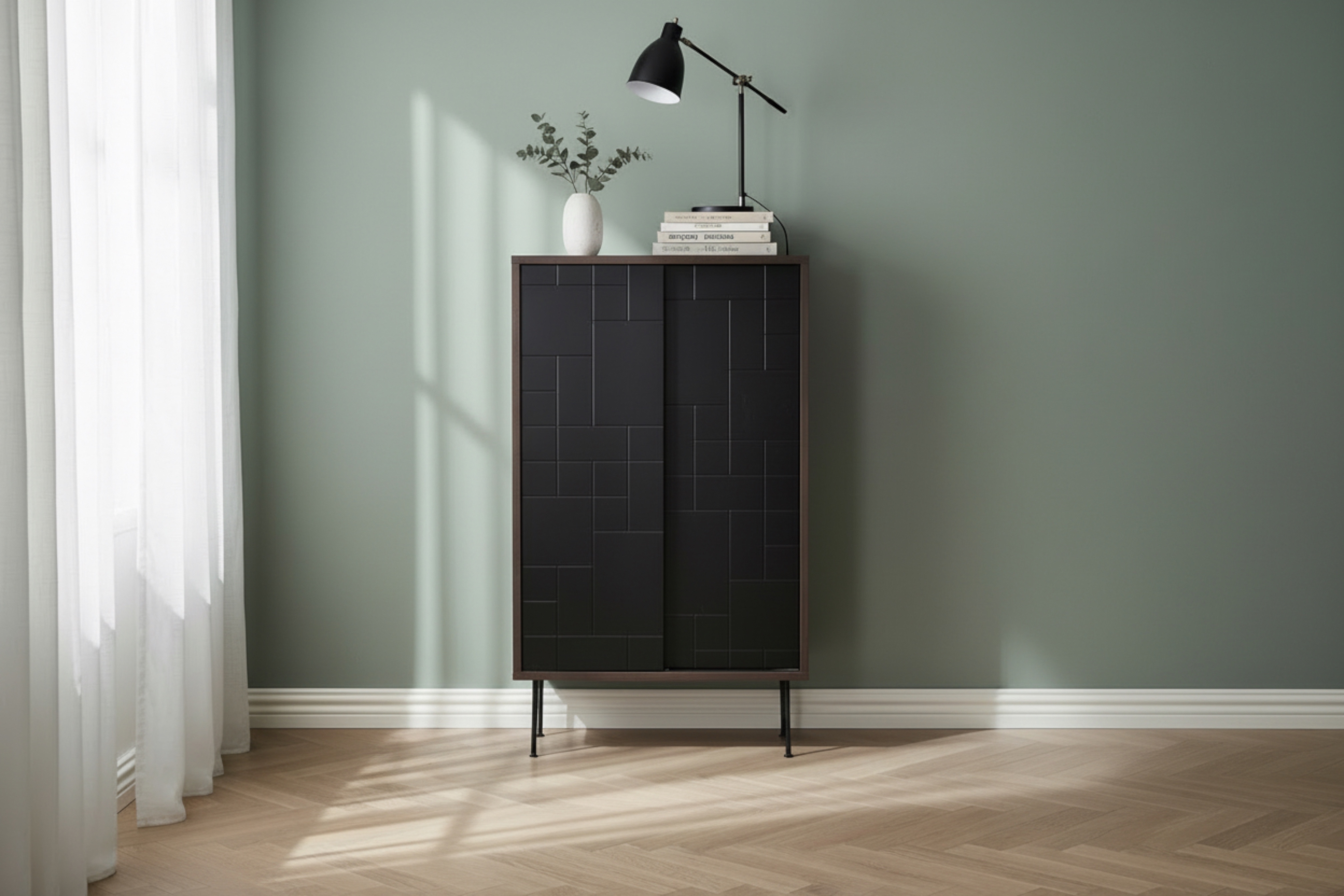 Den grafiskt mönstrade fronten ger möbeln en unik och dekorativ känsla samtidigt som de två luckorna döljer generös förvaring för porslin, glas, böcker eller andra tillhörigheter. Ovansidan erbjuder plats för lampor, vaser och personliga inredningsdetaljer som lyfter helhetsintrycket.