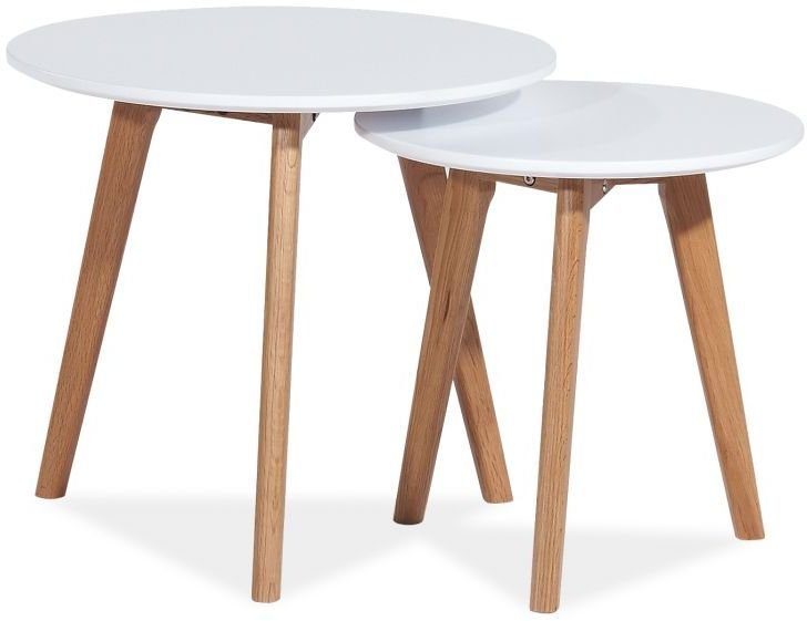 Ett par snygga satsbord med en stilren design. Bordsskivan är av vitlackerad MDF och benen är av metall och fanér.