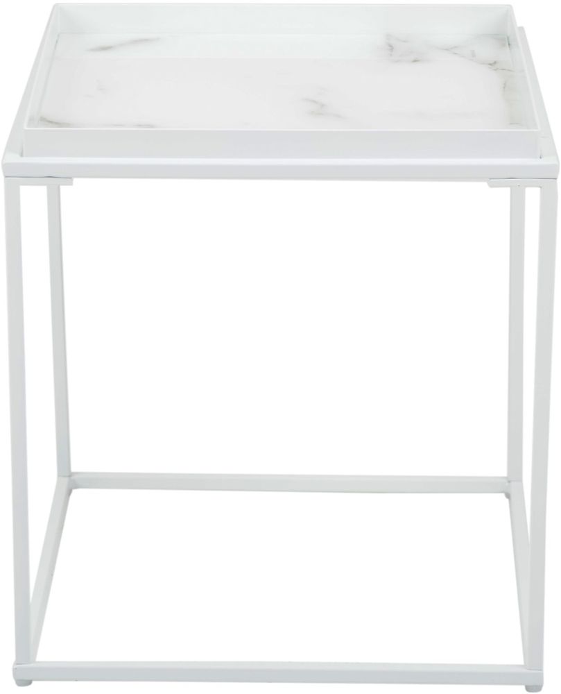Modernt sidobord i marmorlaminerat glas med underrede i vit pulverlackerad metall.