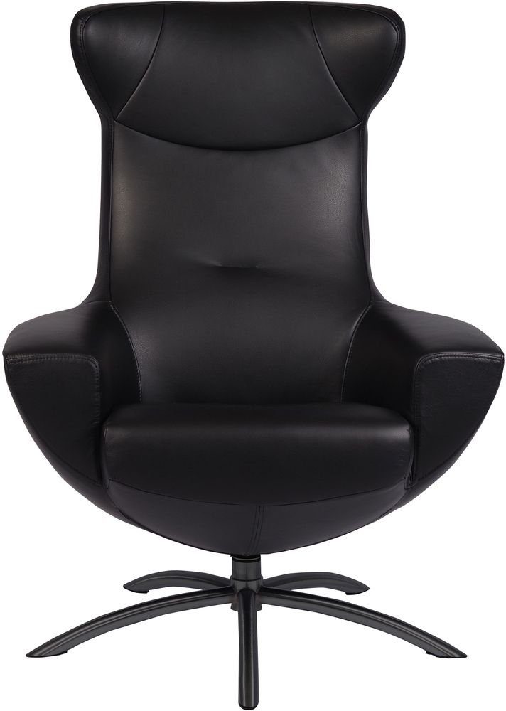 En mysig fåtölj med en retro design. Underredet är tillverkat av svartlackerad metall och sitsen har både gung och snurr funktion. Sitsen är av formgjuten kallskum och klädd med ett mycket behagligt svart skinn för maximal komfort.