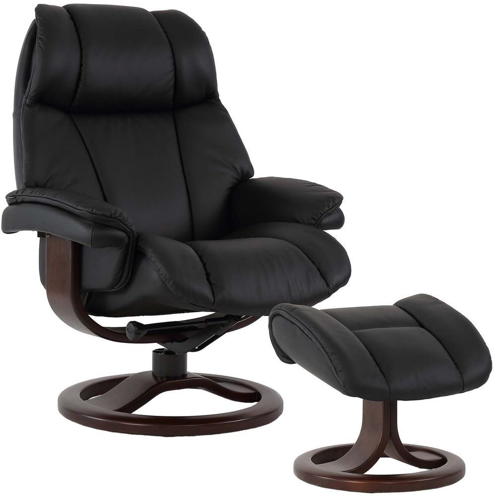 En härlig fåtölj med fotpall i modern design. Underredet är tillverkat av trä med espresso utförande och sitsen är klädd med härligt svart helskinn för maximal komfort.