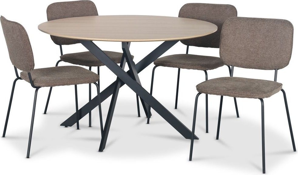 Hogrän matgrupp bestående av ett Ø120 cm stort bord med toppskiva av MDF i utförande ljust trä, underrede av svart pulverlackerad metall. Ingår gör också 4 st Lokrume stolar med brun klädsel och svart stomme. En matgrupp i stilren modern design. Fokus på att vara minimalistisk i sitt utförande och färgval som passar bra ihop.