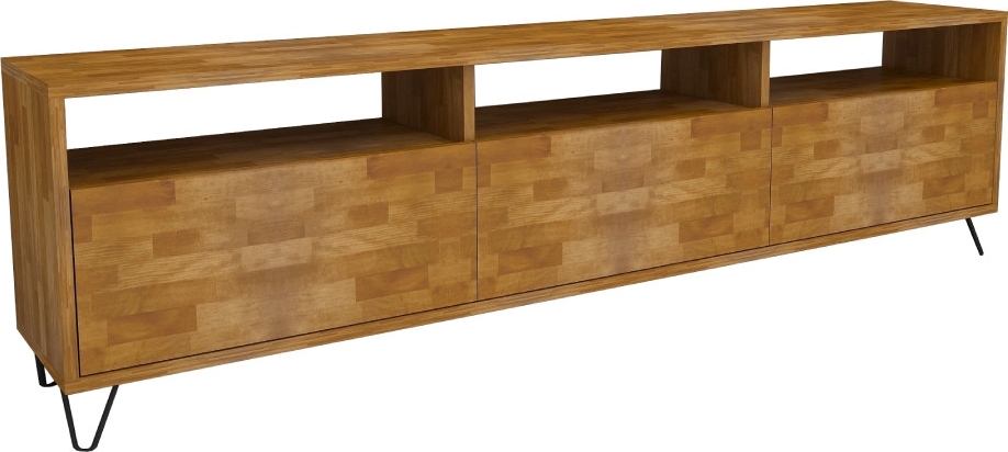Mediabänk av furuträ och metall.