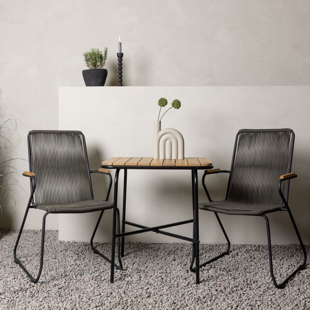 En behaglig och charmig cafégrupp till den lilla balkongen eller uteplatsen! Vårt stilrena cafébord Holmbeck har en modern, ribbad bordsskiva i Akaciaträ och ett minimalistiskt underrede i svart stål. Här tillsammans med 2st gråa matstolar från serien Bois. Stolen har en sits i slitstarkt rep i en populär grå färg och smal stomme i svart stål. Duka ut fikan och njut av en mysig stund utomhus! Bordets mått: 74x70x55cm.