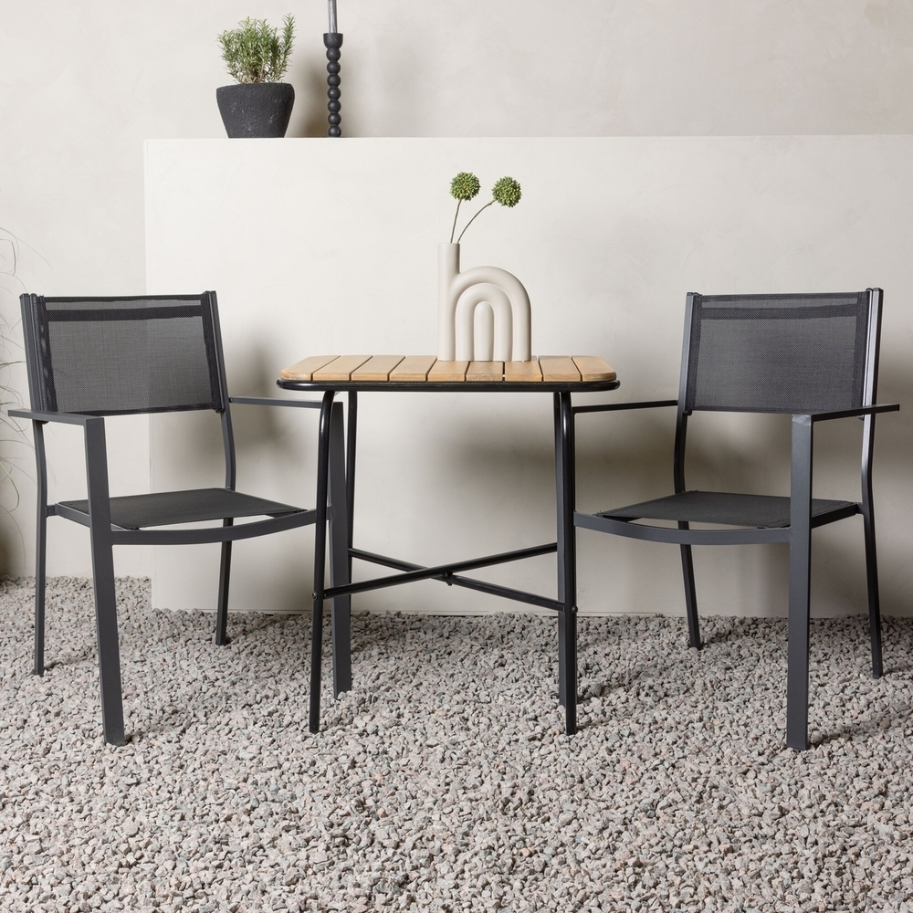 En iögonfallande cafégrupp till sommarens fikastunder! Vårt stilrena cafébord Holmbeck har en modern, ribbad bordsskiva i Akaciaträ och ett minimalistiskt underrede i svart stål. Här i snygg kombination med 2st svarta matstolar från serien Copacabana. Stolen har en rak nordisk design i svart aluminium och sits i textilene. Den här gruppen passar perfekt till den lilla balkongen eller uteplatsens soliga hörna! Bordets mått: 74x70x55cm.