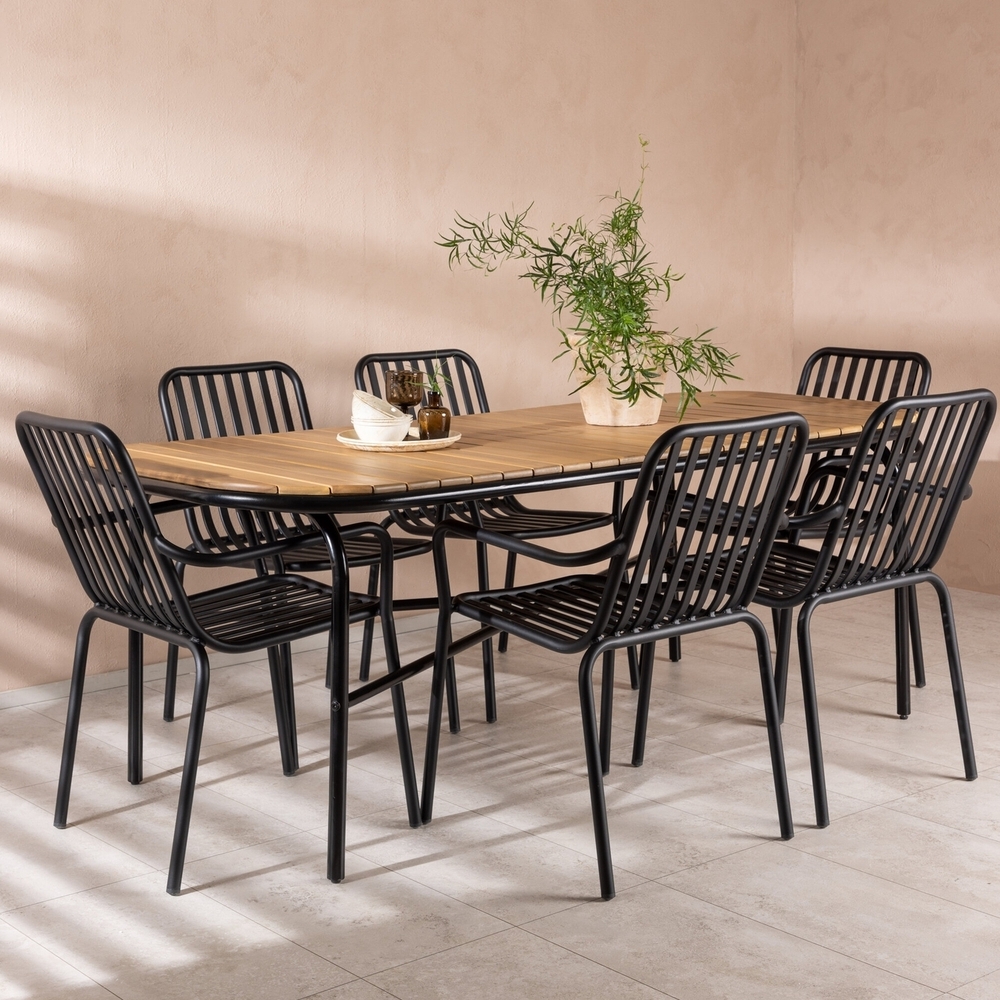 Välkomnas hem till en snygg matgrupp med alla charmiga rätt! Det populära matbordet Holmbeck har en rektangulär bordskiva i elegant Akaciaträ med rundade kanter och ett minimalistiskt underrede i svart stål. Här i perfekt kombination med svarta matstolar från serien Peking. Stolens ribbade utförande och sotiga svarta kulör gör att den både känns modern och tidlös. Tillverkad i aluminium som gör den enkel att flytta runt och integrerade armstöd för extra komfort. Låt tiden här bli dagens höjdpunkt! Bordets mått: 200x90x75cm.