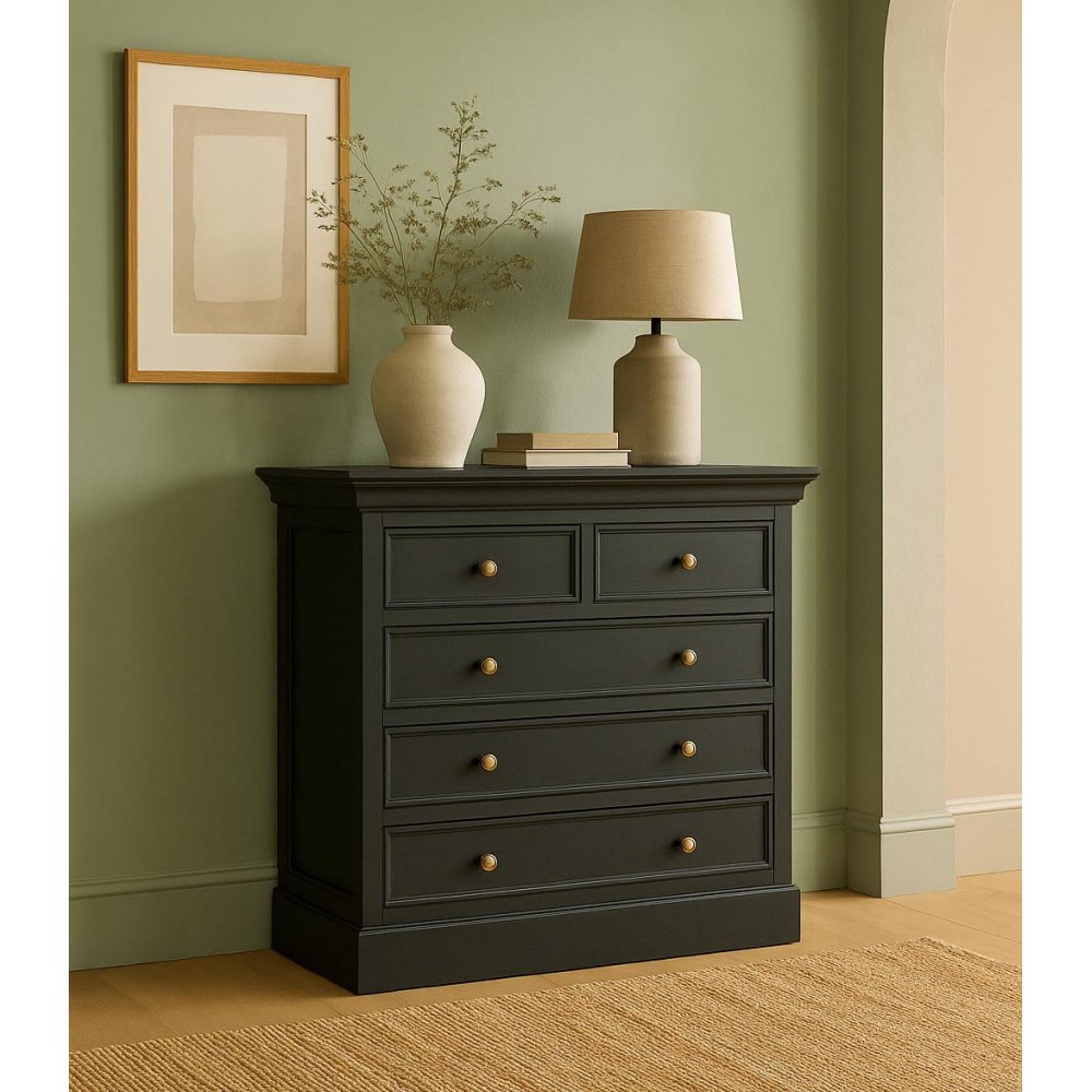 Byrå med klassisk design i svart askfanér med bra med förvaring med sina 3 stora lådor och 2 mindre lådor upptill.