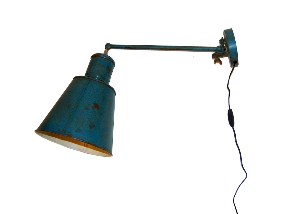 Vägglampa i metall, blå med förgskiftningar för en vintage-look. Insidan av lampskärmen är vit. Varje lampa är unik och kan därför skilja i finish.
