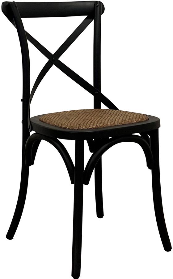 Matstol av lackad björk med krysstag av metall i ryggen och rottingsits.