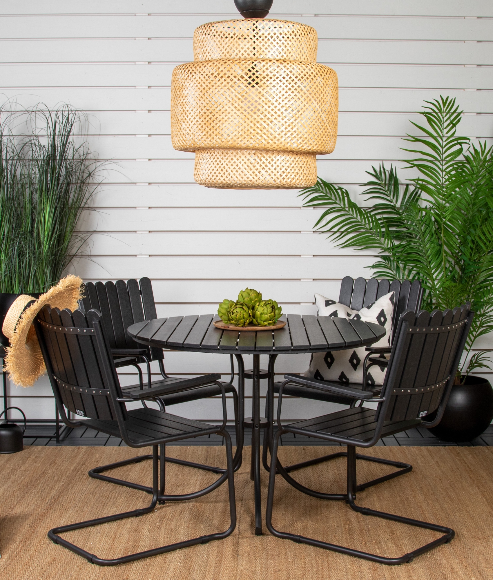 Den här smakfulla och eleganta matgruppen i modern design har alla rätt. Matgruppen skapar snabbt ett läckert blickfång i din trädgård med sin charmiga utformning. Bordsskiva och stolar är i det slitstarka materialet aintwood i svart kulör och har snygga detaljer i stål. Här hamnar ingen på kanten och du får en modern mittpunkt att samla nära och kära kring.