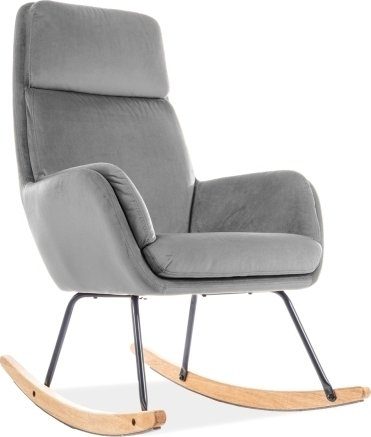 Gungstol i metall och bokträ. Klädd i polyestertyg i sammetsimitation.