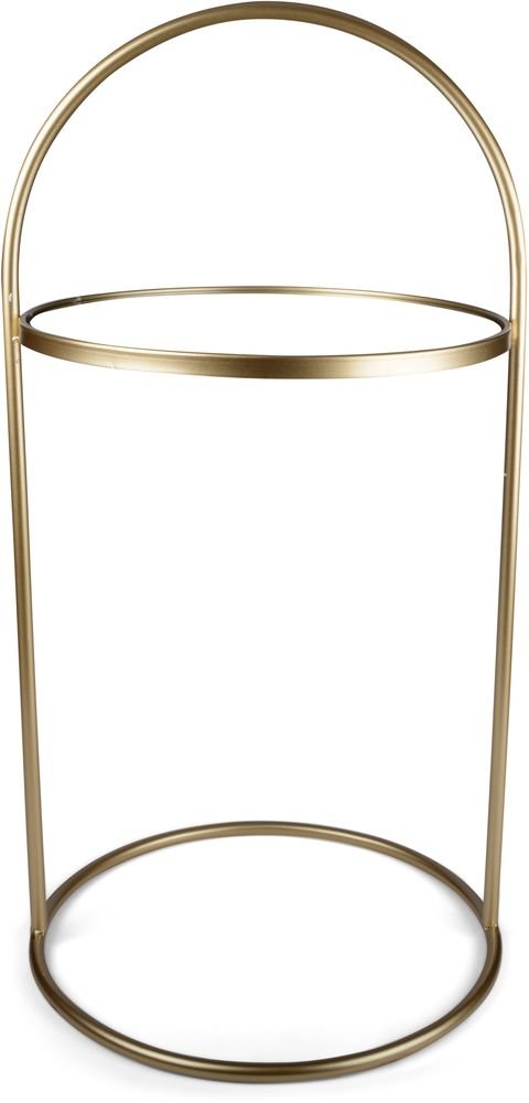 Ett snyggt hörnbord med en modern design. Tillverkat i guldfärgad metall med en bordsskiva i klarglas och ett praktisk handtag för lätt förflyttning.