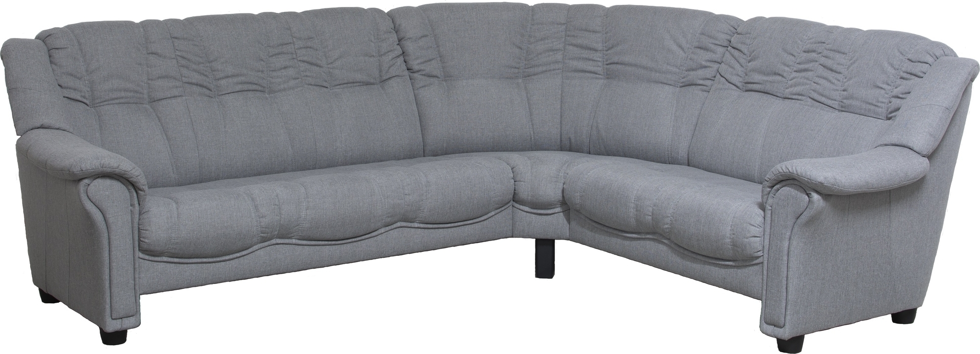Rom hörnsoffa i grått tyg med svart ben. Soffan går att sätta ihop både som 3-sits + hörna + 2-sits eller om man vill ha 2-sits + hörna + 3-sits.