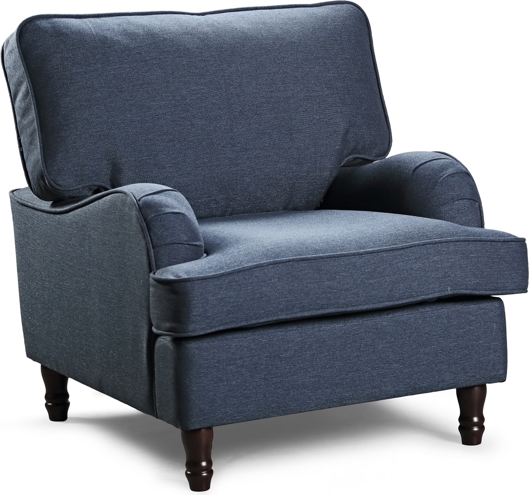 Blå klädsel. Snabb leverans. Gedigen konstruktion. Arbetade detaljer. Hög sittkomfort.