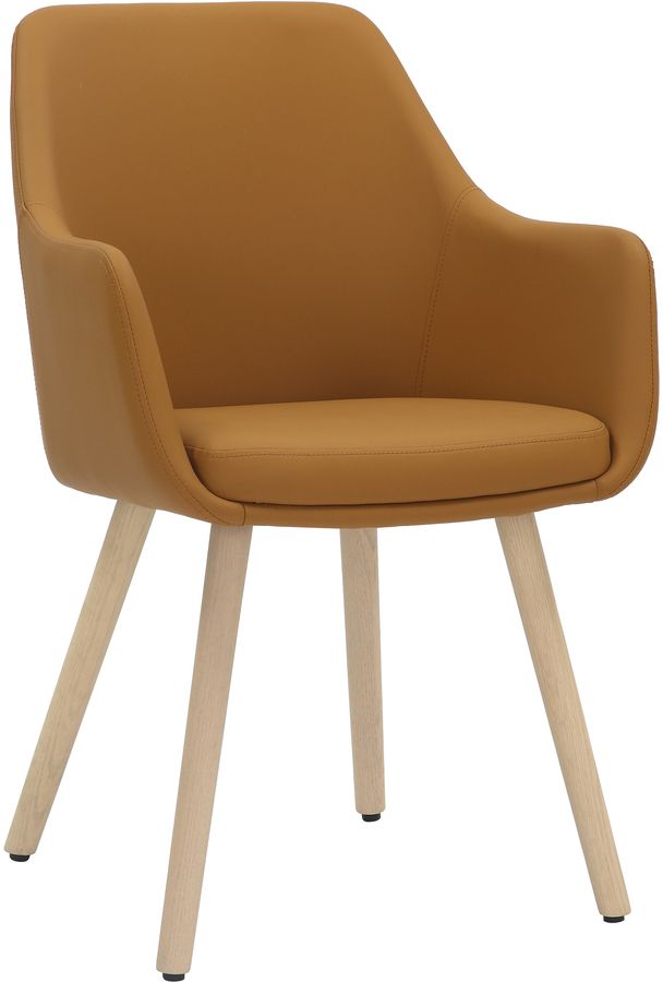 Hugo karmstol i brunt tyg med sits av kallskum. Vitpigmenterade ekben.