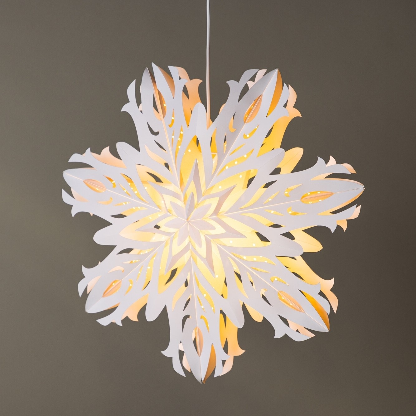 Taklampan från serien Hundfjället kommer sätta stämningen till din inredning i vinter med sin vackra utformning och mysiga ljus! Denna vita pappersstjärna, som är formad likt en snöflinga, ger ditt rum en stämningsfull charm och sprider ett behagligt sken i varje rum den placeras i. Den här snöflingan är inte bara perfekt för de mörka vinterdagarna, utan den skapar även en högtidlig stämning under julens firande. Sätt upp den i vardagsrummet, matsalen eller sovrummet för att skapa en mysig och varm atmosfär. Den vita sladden smälter smidigt in mot den ljusa väggen eller fönstret och med ett enkelt knapptryck kan lampan tändas av och på. Förvandla ditt hem till en plats där du kan fly vardagens stress och omfamna en känsla av lugn och harmoni. Det ska kännas mysigt att komma innanför dörren och mötas av säsongens vackra detaljer! Mått: 60cm.