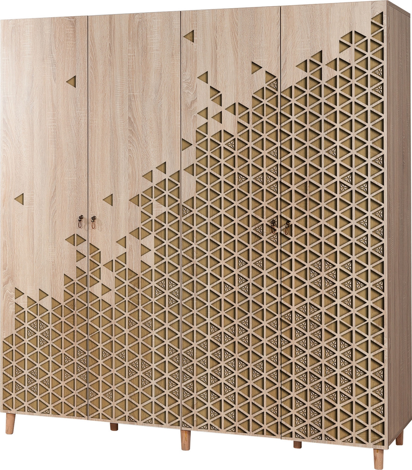 Garderob av melaminbelagd spånskiva med ben av avenbok och handtag av metall och rep.