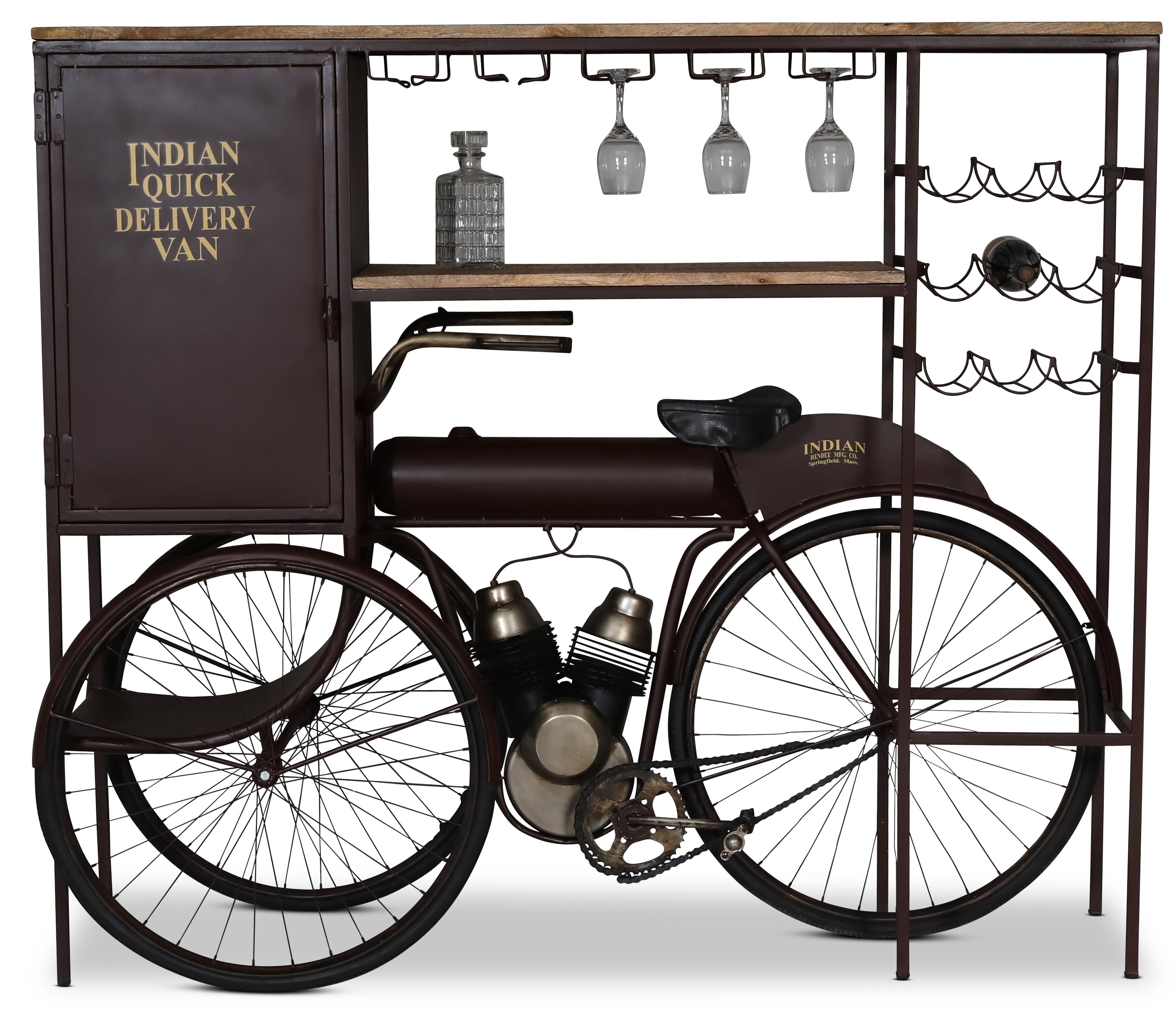 Bardisk i vintage, designad efter en trehjulig moped. Utrustad med alltifrån barskåp, vinställ och upphängning för vinglas. Tillverkad av massiv mango och metall. En både praktisk och uttrycksfull möbel.