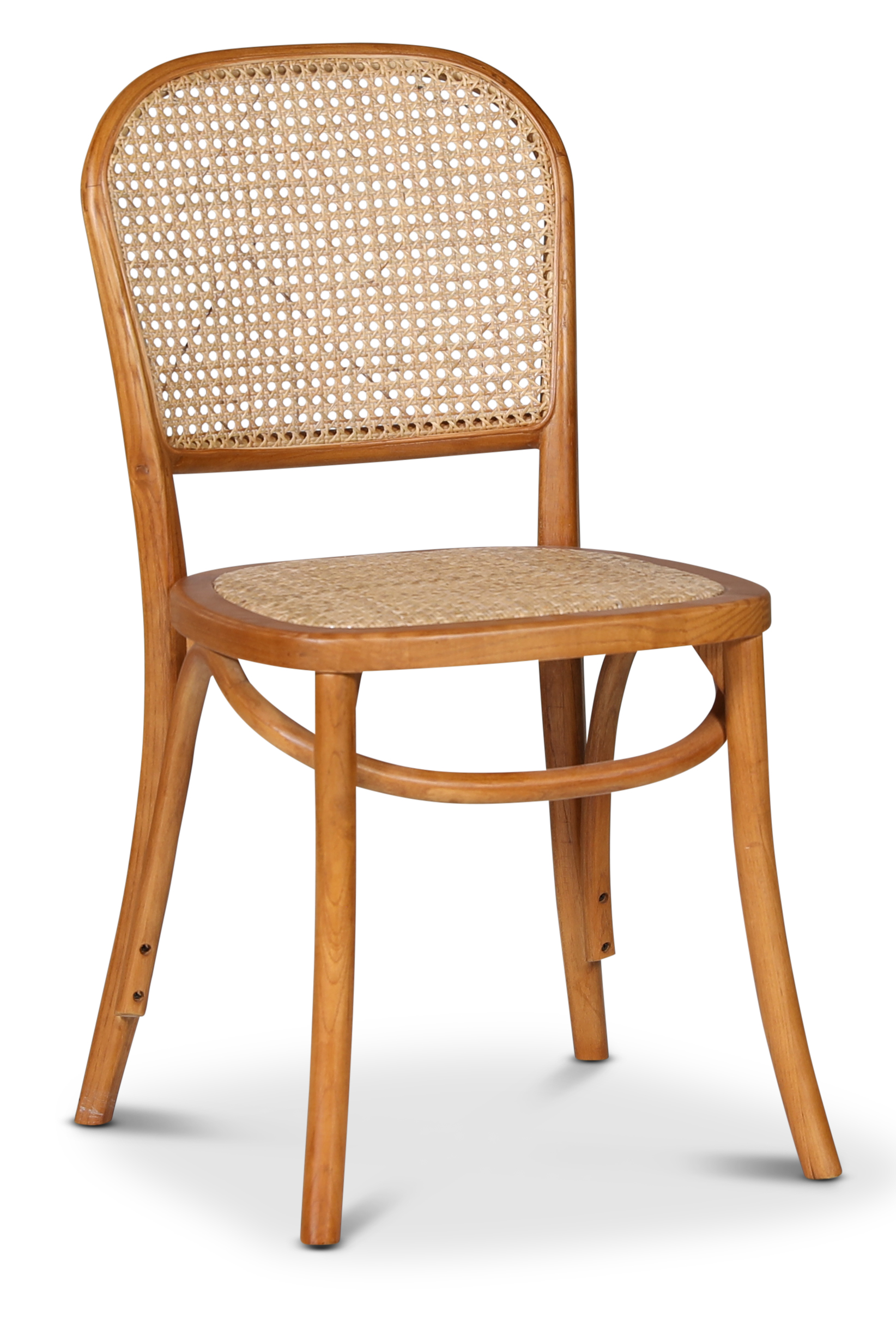 Stilren stol i böjträ med sits- och rygg klädd i rotting. Stommen är av massiv alm. I denna stol framhävs träets naturliga skönhet. Kombinera gärna med något av våra matbord.