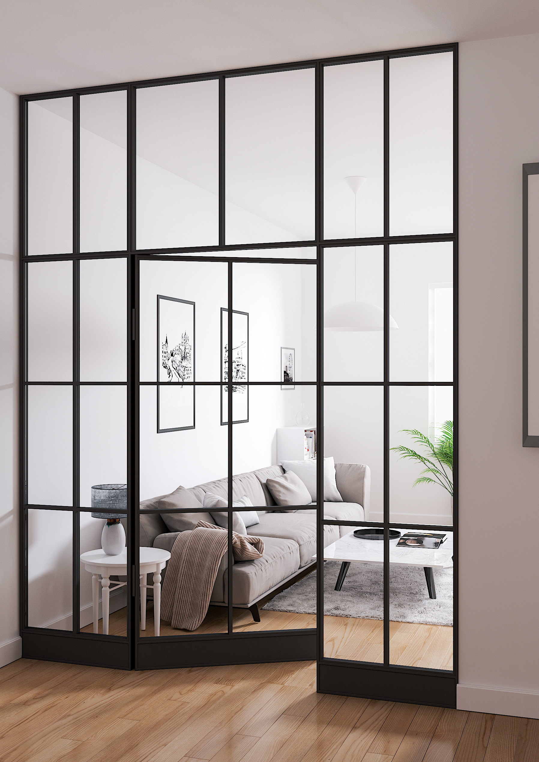 Utan några större ingrepp kan du förvandla ditt rum med denna glasvägg och avgränsa för att få mer avskildhet. Glasväggen är perfekt att förvandla en stor etta till en tvåa utan att göra rummen mörkare.