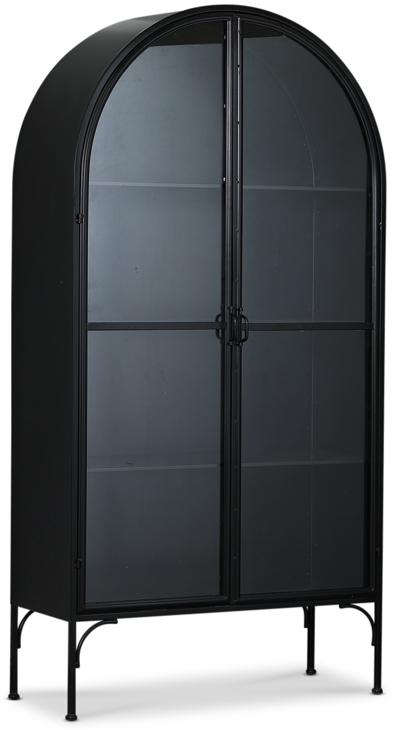 Vitrinskåp i lackad metall med tre fasta hyllplan. Erbjuder gott om förvaring. En möbel som inger en rustik känsla med tanke på materialval. Tåligt och robust. Dörrar med handtag i metall och magnetlås. Varje hyllplan klarar en vikt på 10 kg. Levereras monterat. Fäste för vägg medföljer.