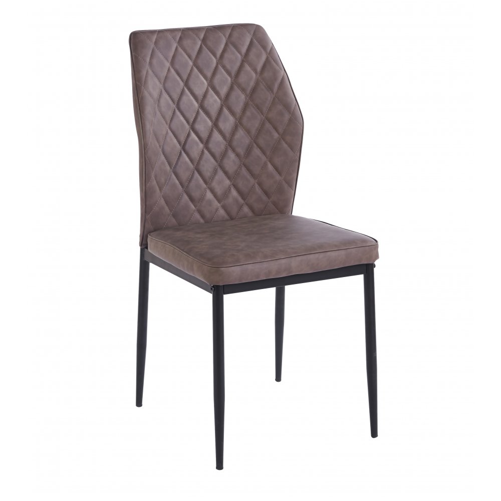 Inez matstol med en stoppad sits och rygg som är klädda i ett brunt vintage konstläder. Benen är i svartlackerad metall. Matstolen passar både till runda bord som rektangulära matbord.