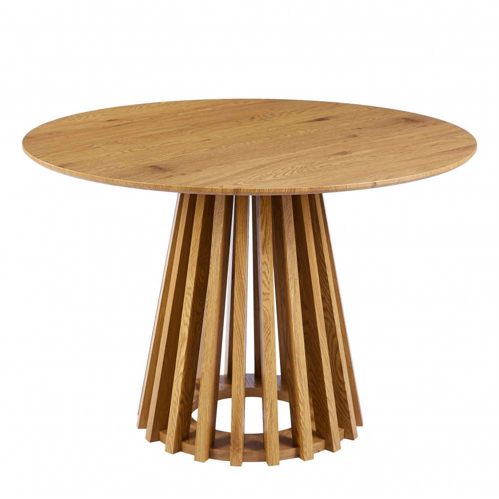 Inez runt matbord med bordsskiva i ekfoliering som matchas med underrede i ekbetsat trä. Modern design och känsla. Bordets toppskiva är 18 mm tjock. Matbordet har plats för 4 till 5 personer.
