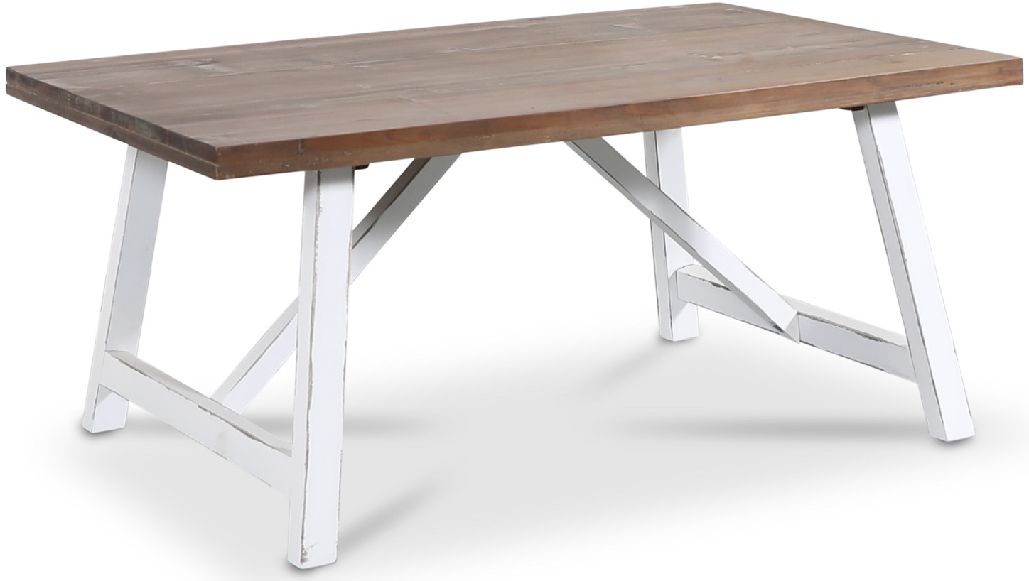 Robust soffbord i antikbehandlad furu med brunbetsad bordsskiva och vitt underrede.