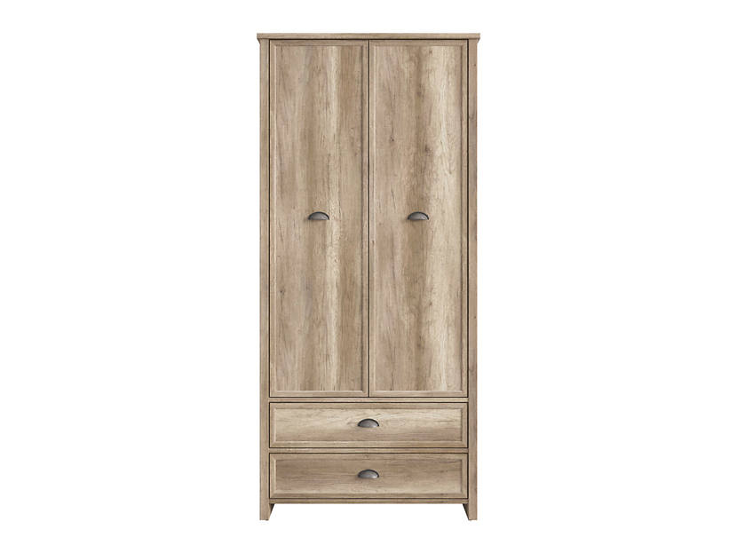 En garderob i ek med skålhandtag i metall. Garderoben ger en lantlig känsla och har två praktiska lådor underst. Den är inredd med en klädstång som gör det enkelt för dig att hänga dina kläder.