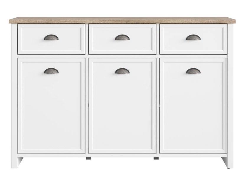 Ett vackert sideboard i vitt med en lantlig stil och en bänkskiva i ek utförande. Sideboardet har tre skåp med skålhandtag och med hyllplan inuti, samt tre lådor ovanför vilket gör möbeln ideal för smart förvaring.