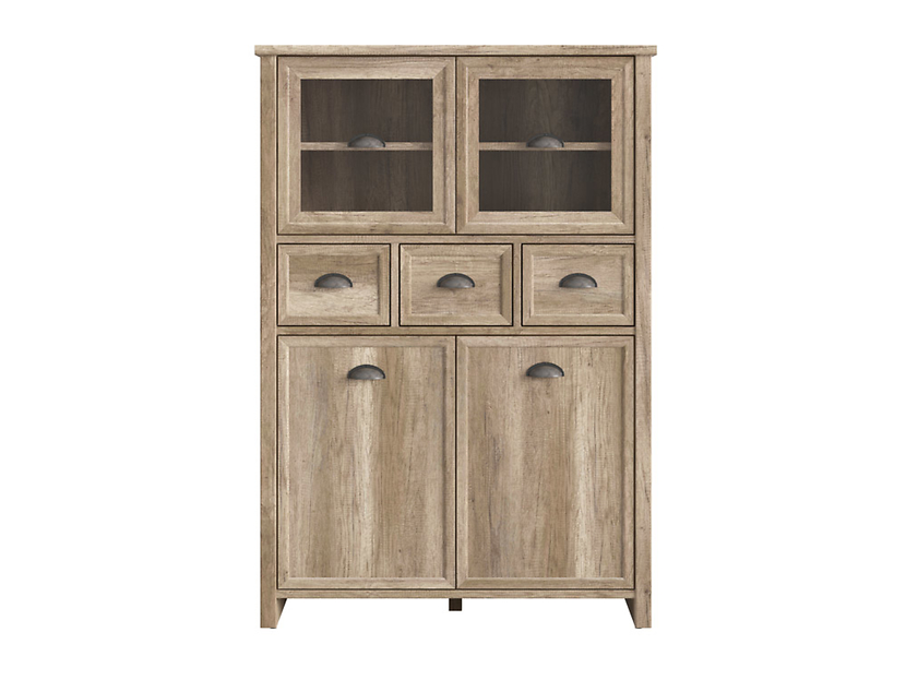Ett vackert lantligt skåp i ek med skålhandtag. Skåpet har många förvaringsmöjligheter med lådor och hyllplan. Skåpsdörrarna överst är i glas och gör det möjligt för dig att visa upp dina finaste saker.