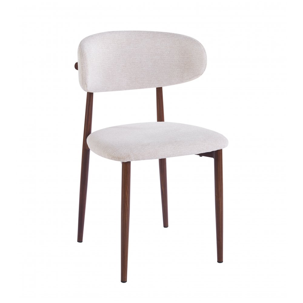 Ingrid matstol med en mjukt stoppad sits som är klädd i ett beiget mjukt tyg. Stomme i valnötsfolierad metall. Matstolen passar både till runda bord som rektangulära matbord.