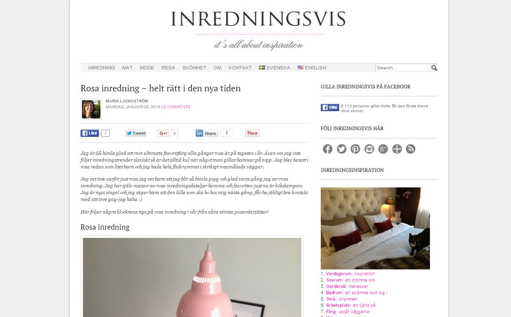 Bor man litet men drömmer stort har man hittat rätt när man tittar in på bloggen INREDNINGSVIS. Maria älskar blandningen av gammalt och nytt och tycker att årets färg rosa var ett bra val. Vi får se bilder på hennes hem och med inlägg som "Tio moderna lampor som rockar rummet", "Inreda liten lägenhet: 6 bästa tipsen", "Gör så här: 6 tips att förstora litet rum" eller "Fuktskador: 5 tips för att slippa dem" så visar Maria sin vilja att vara en aldrig sinande inspirationskälla, hon listar och sammanfattar allt möjligt inom inredning men också resor, mat och mode med ett klart och tydligt budgettänk, hur vi kan få inredningen att se dyr ut utan att vara det. Och vem vill inte kunna unna sig lite vardagslyx?