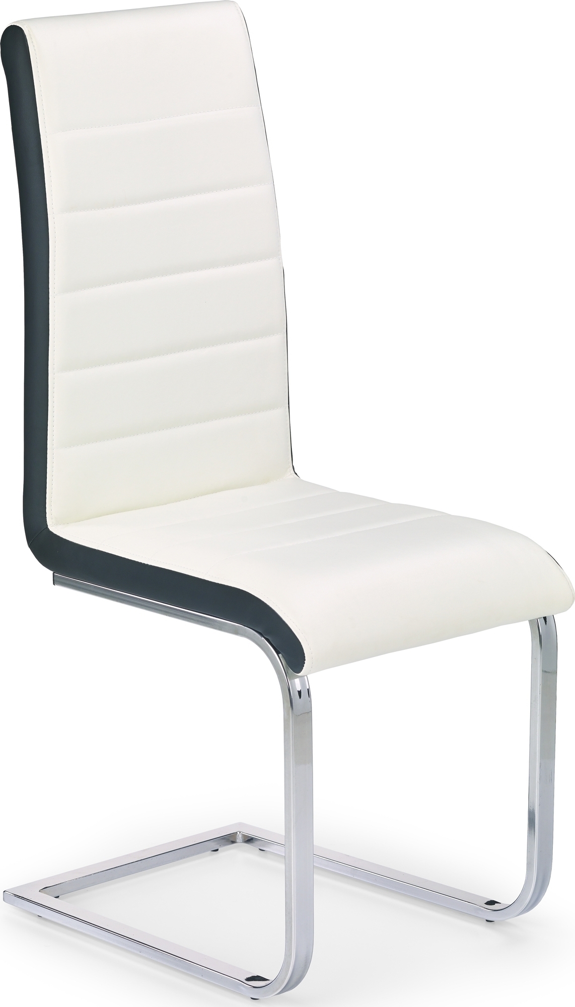 En skön matstol med en modern design. Underredet är tillverkat i kromad metall med sitsen klädd i ett mycket behagligt svart & vitt konstläder för maximal komfort.