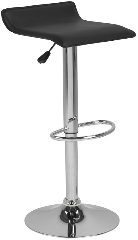 Modern barstol, gjord av PVC med en svart läderlook och kromad trumpetfot av metall. Höj och sänkbar sits med en TÜV märkt gasfjädring.