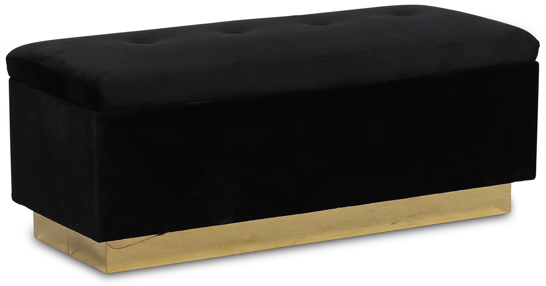 Sängkista med förvaring i en exklusiv design. Svart sammetstyg med mässingsdetaljer i sockeln.