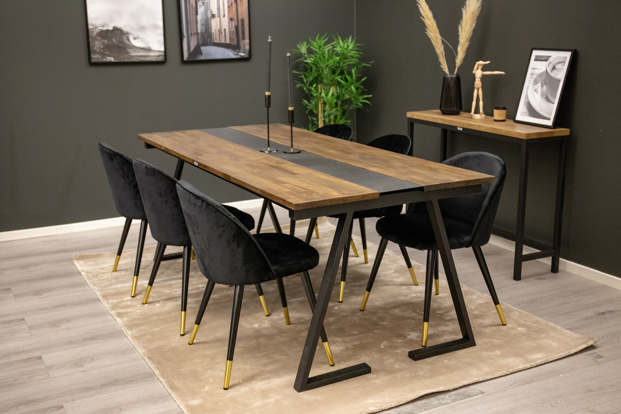 Matbord Jakarta i industriell stil, tillsammans med Velvet-stolarna, skapar en modern och trivsam atmosfär i ditt matsalsrum. Tillsammans ger de ett stilrent och inbjudande uttryck.