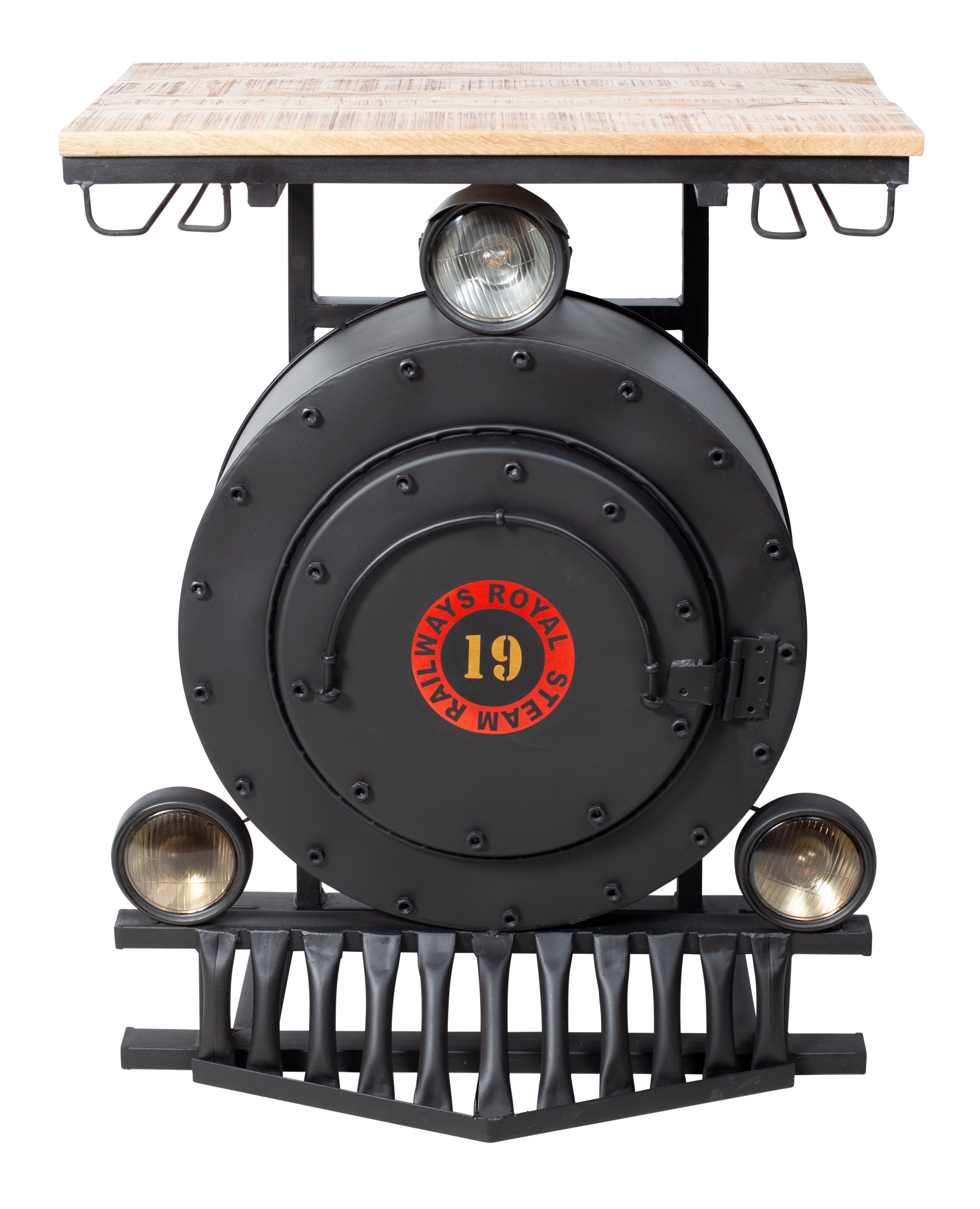 James barskåp och barbord. Belysningen fungerar via lamporna. Toppskiva av massivt mangoträd. Fräckt och unikt för att ha i köket eller på restaurangen. Förvaring för vinflaskor i huven på lokomotivet.