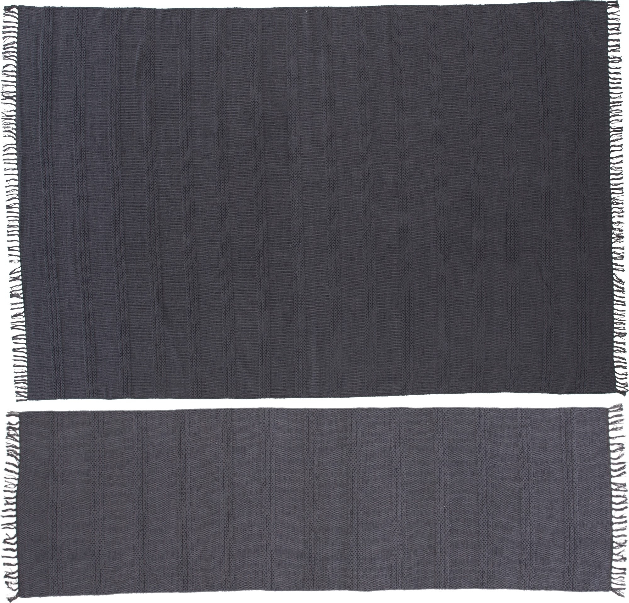 Bomullsmatta i sotgrå färg med dekorativa fransar och flätade detaljer.