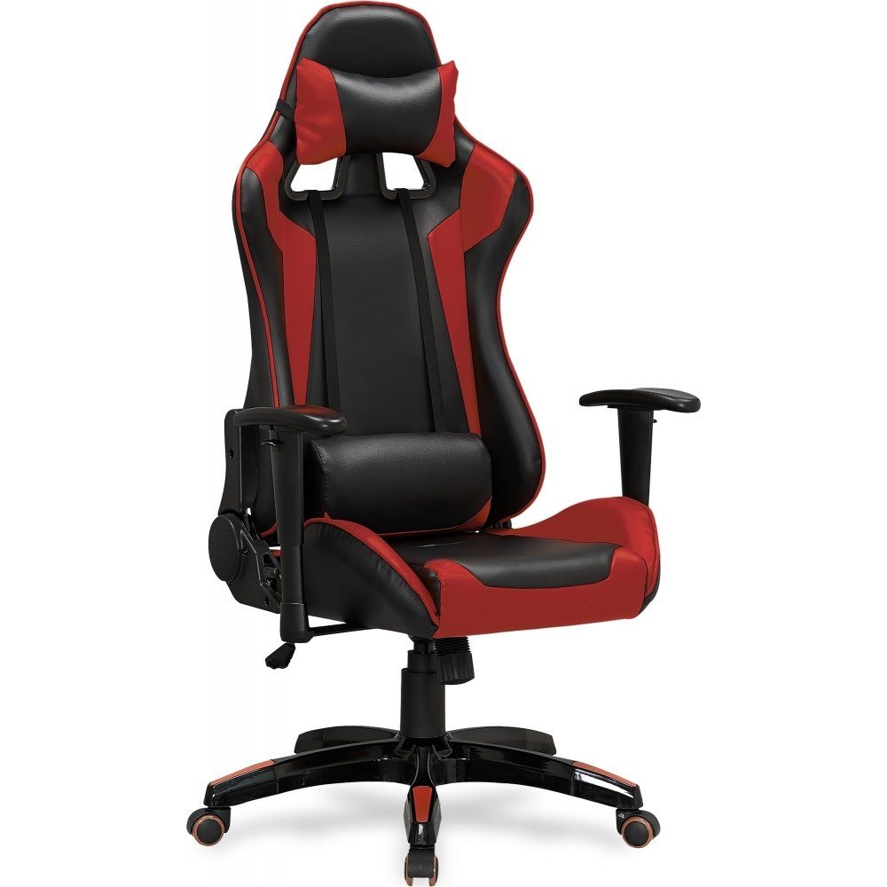 En härlig gamingstol med en modern design. Tillverkad i metall med detaljer i plast och en mycket behaglig klädsel i svart & rött konstläder med praktiska rygg och nackkuddar för maximal komfort. Sitsen är höj-och sänkbar samt lätt att förflytta med hjälp av hjulen under stjärnfoten.