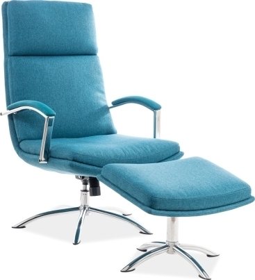 Fåtölj av metall och bokträ. Klädd med polyestertyg. Fotpall ingår.