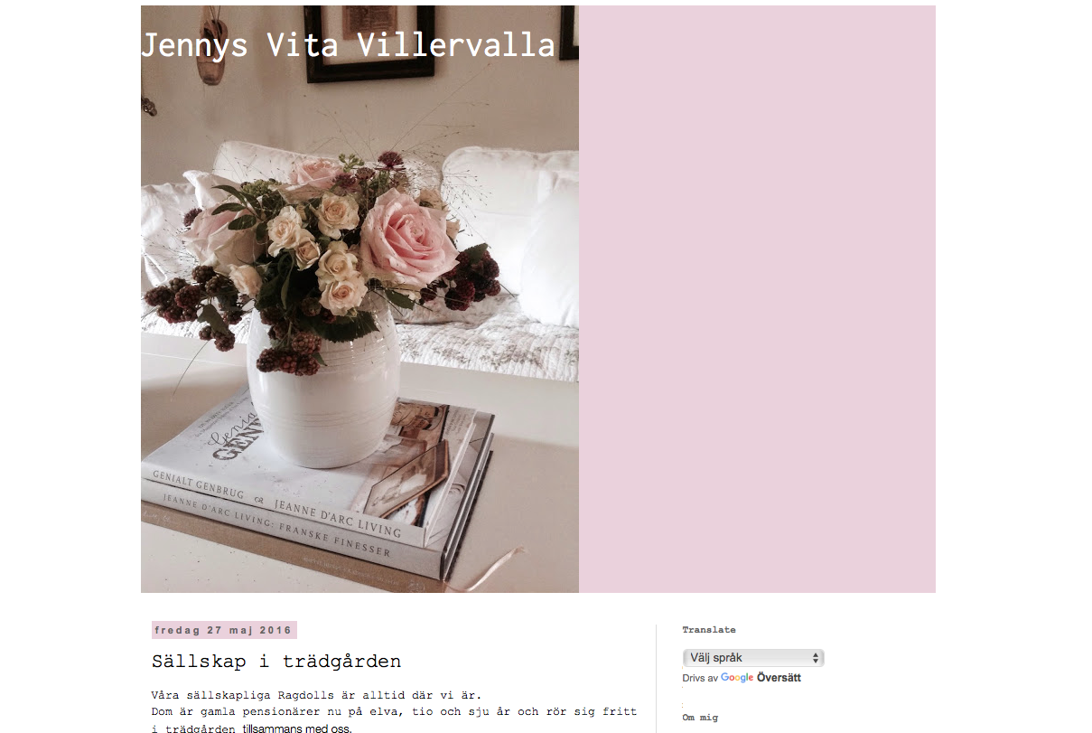 Jennys Vita Villervalla är en blogg som försvann och kom igen i och med ett nytt husköp. Sammantaget har Jenny bloggat i många år. Bilderna är många och fina, inredningstilen lantlig Jenny älskar vitt porslin, fajans och loppisfynd, rostiga och slitna skatter som hämtas hem från inte bara Sverige utan också Danmark och Frankrike. Vi får här många tips på butiker, plantskolor och caféer i Skånetrakten. Trädgården är ett kapitel fär sig själv, trädgårdslandet har fått ett så fint kastanjestaket bakom sig. Det odlas i pallkragar, krukor, på friland, korgar, fina zinkhinkar och ja allt möjligt som blir vackert i odlingen. En gammal dörr från ett stallage blir något att klättra på för växter och i Törnrosarabatten har aklejorna fått en gammal sänggavel att klättra på. Även katternas kattgräs odlas med omsorg i ett gammalt zinkfat med en odlingpinne i keramik med en katt på så att gänget med Ragdolls hittar rätt. Och Jenny vita virkade sängöverast, broderade örngott och handdukar kan man verkligen inte få för mycket av!