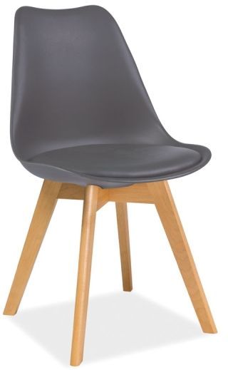 En snygg matstol med en modern design. Underredet är tillverkat av trä med ett härligt bok utförande och sitsen är av gjutformad plast med en sittdyna i konstläder.