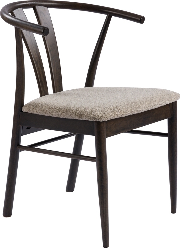 Karmstol med klädsel av tyg och stomme av brunbetsad ek.