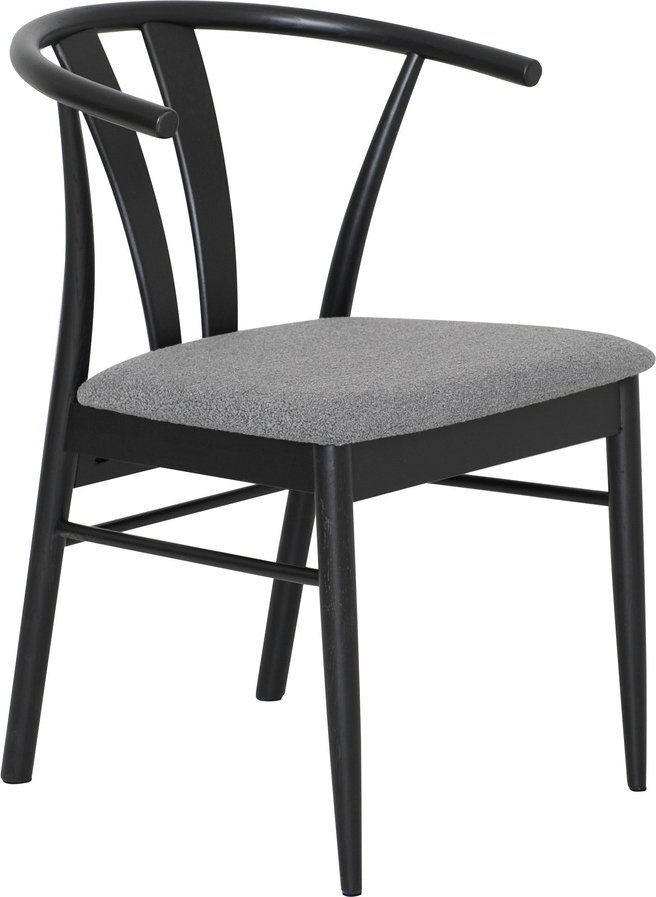 Matstol av lackad ek med klädsel av bouclétyg.