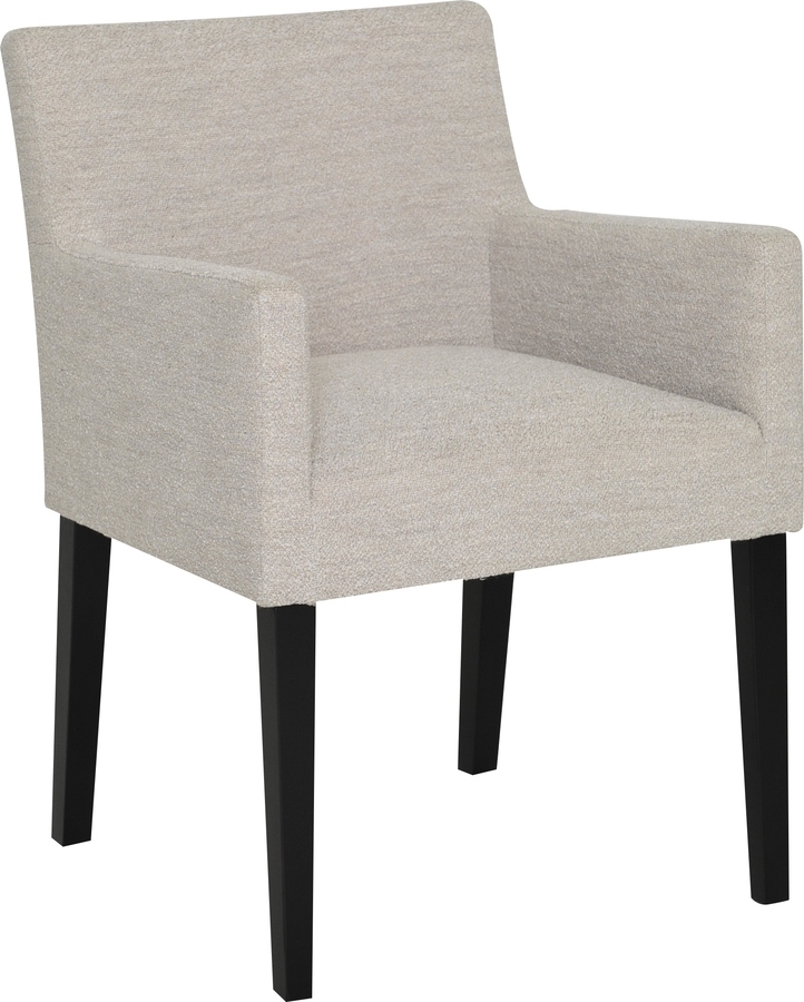 Matstol med klädsel av bouclétyg och svartlackerade träben.